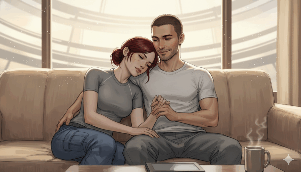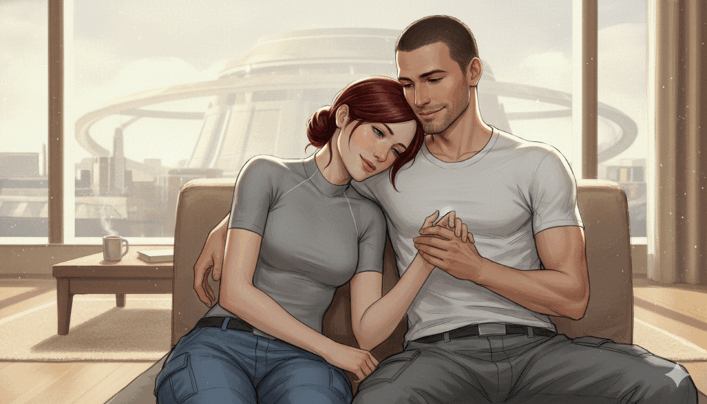 У Леи Шепард роман с Джокером — медленный слоубёрн, когда ценность друг друга оба осознают только по окончании войны со Жнецами. Но каждый раз, когда я задумывалась о том, как и где они будут жить, терялась в догадках. Я сомневалась, что Лею Шепард во второй раз восстановят такой же, как новенькой, да и не хотела этого. Лея Шепард должна была стать уязвимой, чтобы принять заботу и любовь. Джефф должен был увидеть её хрупкой, чтобы понять её ценность.